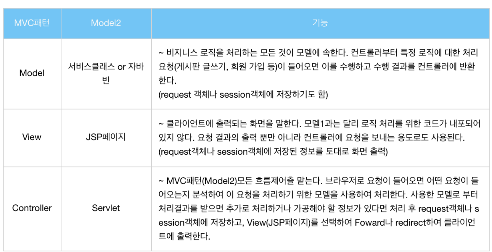 (Servlet & JSP - 둘다 같은 역할이 가능하다. 하지만 MVC패턴에서 둘의 역할을 나눠서 장점을 활용해 담당하는 부분을 나눴다. 기존에는 Model1으로 불리는 JSP만 이용해 개발하는 모델을 사용했다.)